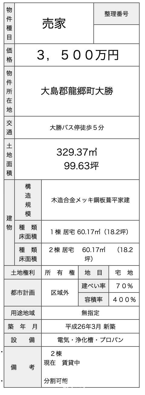 取引態様 | 0 | 所在地 | 龍郷町大勝 |