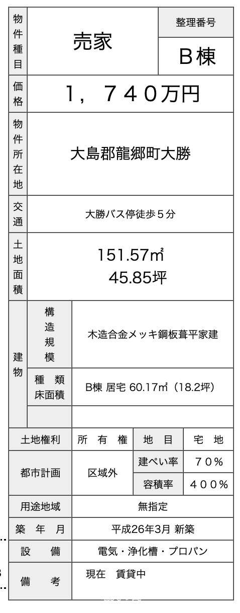 備考 | 構造規模:木造合金メッキ鋼板葺平家建 床面積:B棟 居宅 60.17㎡(18.2坪) ■現況: 所有者居住中 |